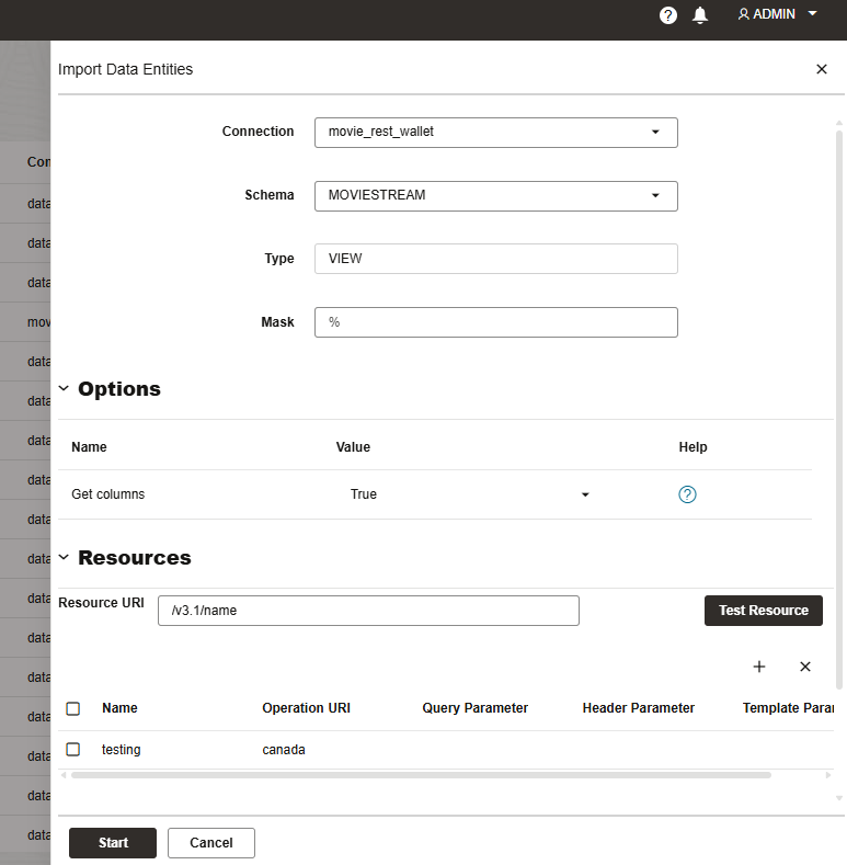 Select the connection we had created before. At resources, select all the URL except Canada for Resource URI and set cadanda for the Operation URI. The name can be anything. In this case I called testing.