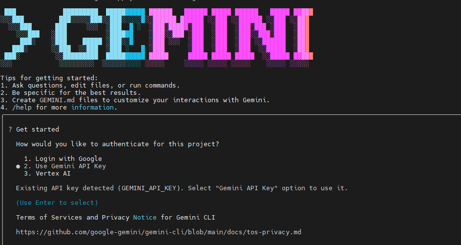 As this is a test, I will use the FREE plan from Gemini CLI. The only thing that I need is my Google account. When authenticating, I need a key that can be generated from Google AI Studio. You can go there and generate yours. Save the key because you will need it later!