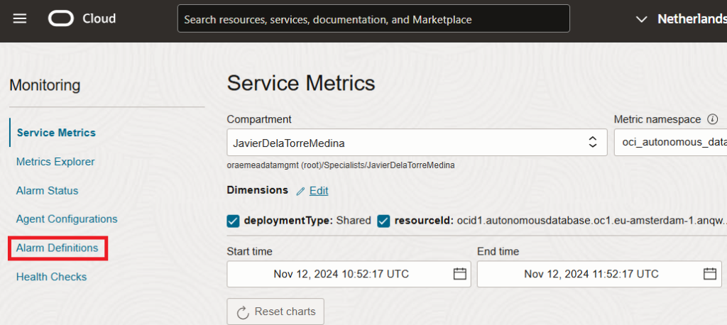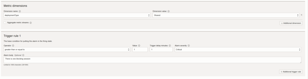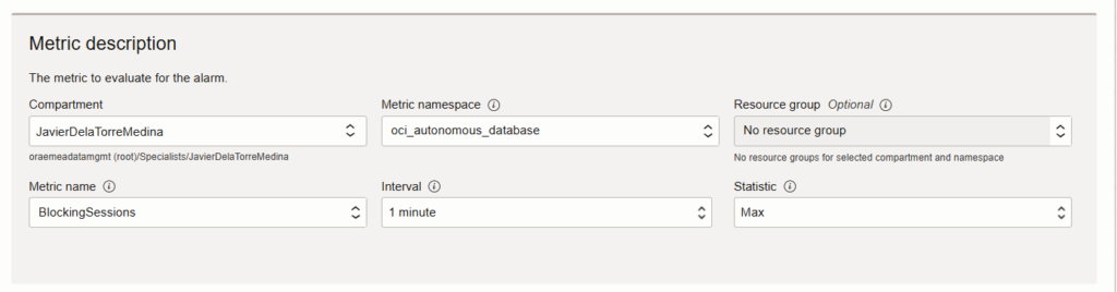 We need to select the metric we are interested in. In this case we need to find the “BlockingSessions” which is under the namespace “oci_autonomous_database“. It is important to define the statistic, in this case we selected “Max“