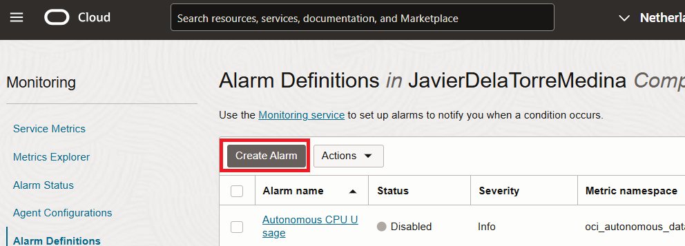 We will create the alert directly, so go to Alarm Definitions to create a new one.