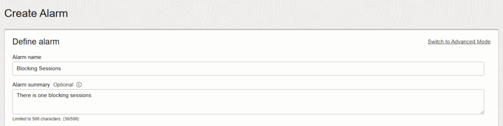 Now we can give a name to identify the alarm. In this case I will call it Blocking Sessions.