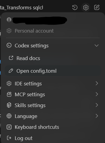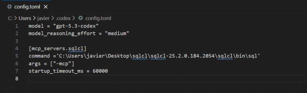 Then, in Codex config, I opened the config.toml and I pointed to the SQLCL directory.