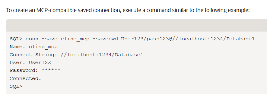 Now we need to define the connection from sqlcl mcp. I had run the sql.bin in the desktop and I had set the connection string to my Oracle Autonomous AI Lakehouse. Here you can see an example from the documentation.