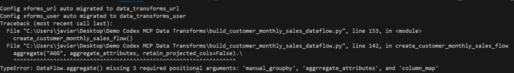 In this demo I have the tables already populated, so Codex can read the tables and generate the Python code. The only thing I’m providing is the data flow I want to generate, the link to the official documentation (just to be sure) and the aggregations I want to run.