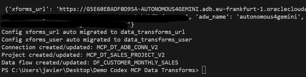 In the first iteration, It didn’t created the deployment.conf which contains the parameters to connect to my Oracle Autonomous Data Transforms. Also I told Codex to ask for any parameter it needed to generate the full code.