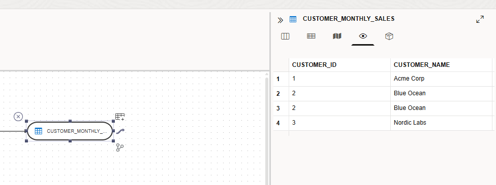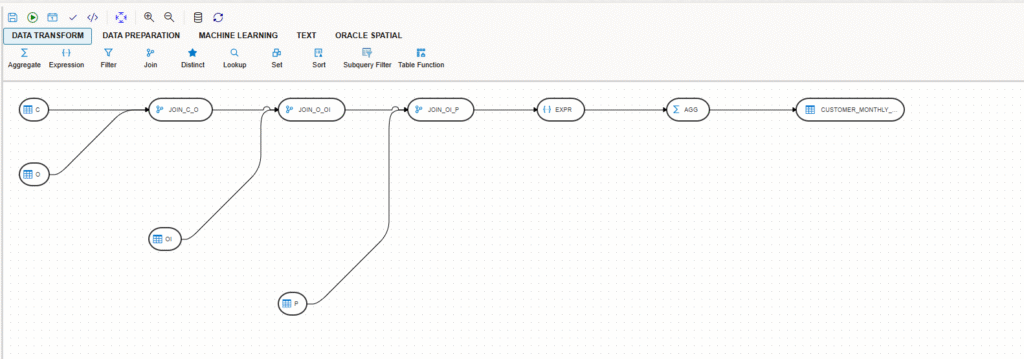 I want to store data flow that stores the results in CUSTOMER_MONTHLY_SALES. To build it, take data from customers, orders, order_items and products and join them. For each order item, compute the line revenue using the unit price, quantity, and the discount percentage: quantity * unit_price * (1 - NVL(discount_pct, 0) / 100) Then aggregate per customer and month (group by customer_id, customer_name, country, order_month)