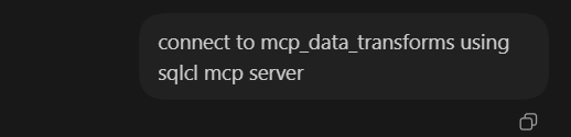 In the step before, I had saved my connection as mcp_data_transforms. Now using Codex I can ask to connect using this connection.