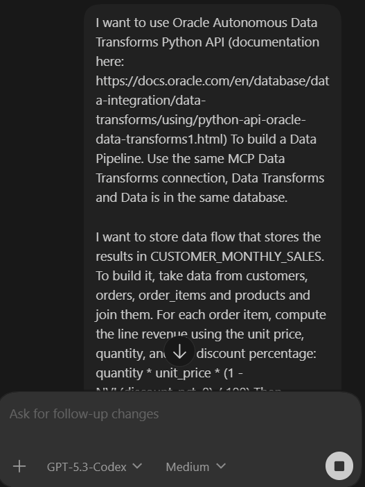 To make it even more interesting, I didn’t write the whole thing myself. I used OpenAI Codex connected through MCP to my Autonomous AI Lakehouse and described the outcome I wanted. The result was a maintainable, code-first Data Transforms pipeline created from a prompt instead of starting from scratch.